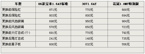 随着城市汽车保有量的逐年增加,交通事故也会随之增加,作为有车族来说小剐小碰是家常便饭,而如果高速行驶时遇到麻烦可就不是小事了,保险杠、风挡玻璃以及前后尾灯首当其冲成为最易受损的部件。三车更换保险杠费用相近,宝来稍贵,而更换风挡玻璃和前后大灯花冠费用最高。为了减少维修费用的支出,更为车主安全着想,开车您还是慢点来。