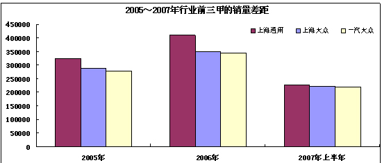 2007年上半年,上海通用数月失去单月销量榜首的宝座,但是,仍顽强的凭借1、2月份的良好市场表现以及业绩的稳定夺取了上半年的总体销量老大,但是,总体感觉是力不从心,《天下无贼》里的黎叔说过:“人心散了,队伍不好带了……”,估计通用一个明显的感觉就是:“对手强了,老大不好做了……”。