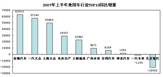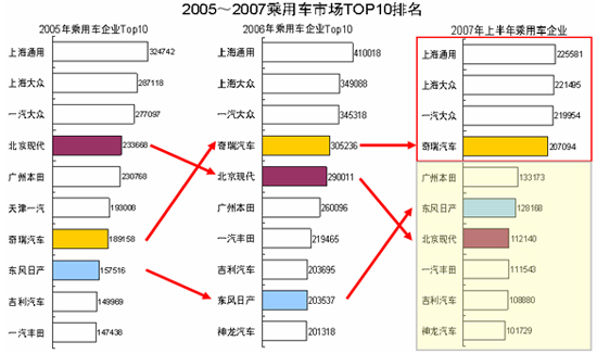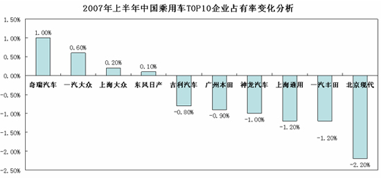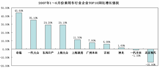 2007年上半年,从乘用车行业十五强的市场占有率来看,各企业的排名正好是“七上八下”,其中,“七上”的企业根据业绩排名分别为:奇瑞、一汽海南、东风日产、一汽大众、上海大众、长安福特和广州丰田;“八下”的企业分别是:吉利、神龙、天津一汽、悦达起亚、上海通用、广州本田、一汽丰田和北京现代”。