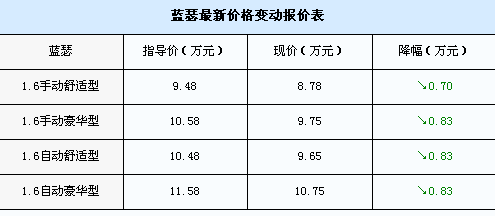 本周经销商处蓝瑟系列依然有着不错的优惠幅度,三车型都有8300元的优惠幅度,相比上周价格保持稳定,短期可能也不会有太大的变化,想要购买的消费者可以考虑一下。