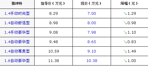 | 1.4 MT 雅适版 | 9.28 | 8.68 | ↘0.50 |
