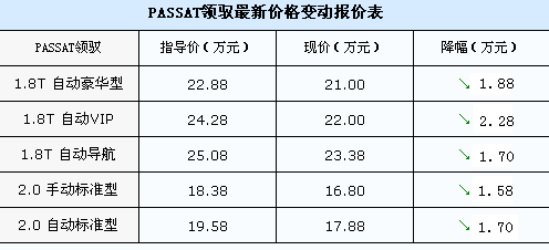 本周,PASSAT领驭的优惠幅度相比7月中旬有所减少,但还是比较诱人的,全系列最高优惠2万多,比较适合购买,喜欢的消费者可以考虑一下。