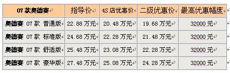记者从一家广州本田专营店中了解到奥德赛全系的优惠幅度大概是在2.4万元左右,并且销售人员说还有一些小的附赠装潢等一些东西需要到店中详谈,而记者从二级经销商处得到的情况,07款的奥德赛自上个星期出现3万左右的优惠之后,现在的优惠幅度又有增长,优惠达到3.2万元,比4S店中的幅度稍微大一些,现在已经跌破20万,最低已达19.68万元,并且都有现车,如有意向可以向经销商咨询。具体优惠情况请参阅下表: