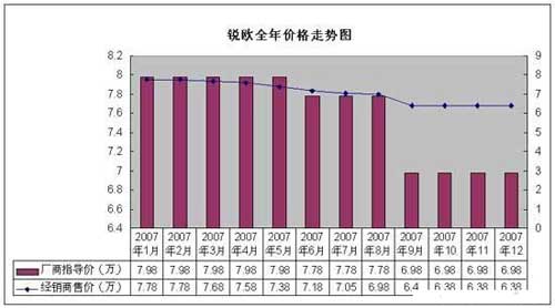 RIO是今年一月中旬上市的,在上市后的短短不到10天时间内,在经销商处便呈现了2000元的优惠,而上市既现优惠的兆头也伴随着RIO一路走来,从上表中我们一目了然,从今年一月伊始至8月份RIO的优惠幅度呈现上升的趋势,这其中厂家进行了2次官降,目的就是为了拯救不断下滑的销量,但5月的官降似乎没有给厂家带来多少利润,于是才有了8月份高达8000元的降幅,而8000元似乎已经触到了消费者的购买神经,从上表中我们能清楚地看到8月的销量猛增到2530辆。由于利润空间的进一步缩小,在经历了8000元的官降之后,9月经销商的优惠幅度有所回落,之后锐欧的价格一直比较稳定。