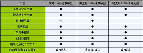 要说到安全性是所有人都非常关心的问题,仅从上面的安全性配置来看,伊兰特相对更为全面,它甚至配备一般在20万元车中才能看到的侧气囊。而前通风碟的制动装置也要优于其余两款。至于主动安全配置上三款车都配备了ABS 与EBD。这些足以应付日常的路况安全。不过仅从安全性配置上并不能完全反映车辆的安全性。稳固的车身设计也相当重要。例如,在今年7月26日发布的国产车型C-NCAP碰撞试验结果就显示,福克斯1.8手动型就获得获得了五星的好成绩。这应该很能说明问题。相关文章链接:【火速抢购! 凯越HRV跌破9万元大关】
