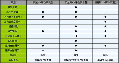 在舒适性配备上面,毫无疑问又是走高配低价的韩系车代表伊兰特获得了全面性领先,在它上面所配备的天窗、真皮座椅、MP3播放功能以及自动空调都是其余两款车所没有的,这些从整体上提升了伊兰特舒适性享受品质。凯越相对就有些简单了,豪华型的配备要在更高款的车型中才能找的到。福克斯则介余二者之间,它的亮点在于内饰布置非常运动时尚,给人的感觉很有激情。相关文章链接:【】