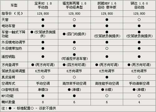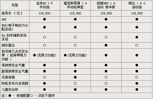 眼下正值寒冷的12月,但车市并没有随着天气而降温,12月16日一汽大众在杭州发布了旗下最新两厢轿车“宝来(报价 参数 图片 论坛)HS”。它的出现为想要购买一款两厢家用轿车的朋友,提供了又一个时尚的选择。那么宝来HS都有哪些竞争对手?而它与竞争车型相比又有哪些优势呢?我们以售价12.98万元(报价 参数 图片 论坛)的1.8L宝来HS为例,选择了另外三款与它价格相同的竞争车型进行对比,下面就让我们一起来看一看: