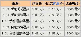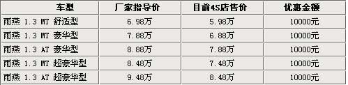 雨燕车型的优惠再度提高,笔者从广州的长安铃木4S店了解到,雨燕车型现在能有8000元的现金优惠,外加2000元的礼品赠送,总的优惠约一万元。1.3L自动豪华型优惠价格只要8万多一点,而且现在的现车还算充足,蓝色,银色等都有现车可提,对雨燕有兴趣的朋友不妨到就近的4S店了解一下。