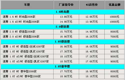 据4S店销售人员介绍,目前速腾全系车型均有优惠。其中速腾1.6手动档车型的价格首次突破13万元,优惠达10000元。而且在此价格基础上添加2000元,可将原车的钢轮毂更换为铝合金轮毂并且可加装全车镀铬装饰条;再添加5800元,可将原车配备电动天窗和倒车雷达。另外,就连8月底新上市的速腾1.8T舒适版车型,目前也均有9000元的优惠。此外销售人员还强调到此价格均为“裸车”价格,如果在店内做保险、上牌等“一条龙”服务,还可送部分装饰。相关文章链接:【新车使用报告--速腾与迈腾(报价 参数 图片 论坛)油耗对比】