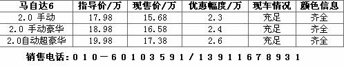 本周,笔者从北京地区部分二级经销商处获悉,马自达6全系车型都有2万元以上的优惠,马自达6自动豪华型优惠幅度达到了2.6万。详细信息请见下表。