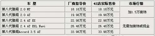 目前消费者在北京地区购买第八代雅阁2.0系列车型,需要在店内购买1.5万装饰即可提到现车。而购买雅阁2.4和3.0系列车型的消费者无需购买装饰或加现金。希望在4S店内通过预订方式购车的消费者则需要交纳1万元的订金,2个月以后提车。