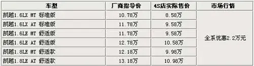 有着车市“新三样”之称的别克凯越自03年上市以来就保持了良好的销量成绩,在10-15万元价格区间牢牢的占据了属于自己的一片市场。近日从上海通用别克汽车厂商获悉到:全新的凯越将于4月12日正式上市。借此市场上凯越的售价也有了进一步松动。据别克4S店销售人员表示,目前购买凯越车型除了可以得到2.2万元的现金优惠外,还可以得到一些简单的汽车装饰。