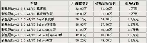随着一汽丰田在4月1日推出了皇冠增配版车型,目前市场上销售的皇冠真皮特别版车型可能会停止生产,各一汽丰田4S店对这款车给出了1万元的现金优惠,而皇冠3.0全系车型的优惠幅度可以达到1.2万元,但是车型并不齐全,订车周期为一个月左右。