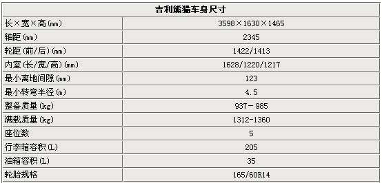 熊猫车长3598mm、宽1630mm、高1465mm,与奇瑞QQ(报价 参数 图片 论坛)基本相当。轴距为2345mm,最小离地间距123mm。车重为标准的 937~985公斤之间,以及满载时的1312~1360公斤。全车可容纳5人,油箱容积为35升,后备箱容积205L。其他方面,熊猫车的型轮胎尺寸为 165/60R14,转弯半径为4.5米。