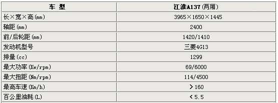 江淮A137采用三菱4G13发动机,排量为1.3L,最大功率达到了69Kw,最高车速超过160km/h,排放为欧IV标准,百公里油耗小于 5.5升。虽然目前还没有配置方面的具体资料,但从目前掌握的信息来看,除了目前同级别车型的基本配置外,还配有双安全气囊、外开式电动天窗、中央遥控门锁、带调频功能单碟CD、倒车雷达系统、车载电源接口等。