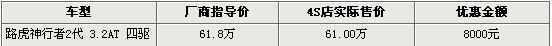 目前路虎神行者2代只有3.2L标配一款车型,4S店内可有8000元的现金优惠。据销售人员介绍,陆续到店的神行者2代均为09款新车,在配置方面,09款增加了后备箱12V电源插座,车窗玻璃调节按钮做了进一步提升,内饰颜色也有改变。消费者在购车同时可以加装1-2万元不等的GPS导航。店内目前供货比较充足,各款颜色也较为齐全。消费者可根据要求选购。