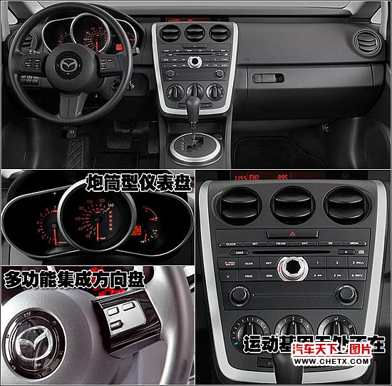 内饰方面,马自达CX-7同样展现出超前的理念和强烈的跑车风格。炮筒型的仪表盘、触手可及的换挡手柄、三幅多功能方向盘,以及具有良好包裹性的前排桶形座椅,不但带有浓浓的马自达DNA,更造就了极富动感且使用便利的操作模式,除此之外,马自达CX-7独特的double-roof设计,在中控台上方加了一片类似屋檐的遮版,除了带来令人耳目一新的视觉感受外,也让车内乘员在阅读中央显示屏上的各项行车信息时,能够不受反光影响而有更好的辨识性。