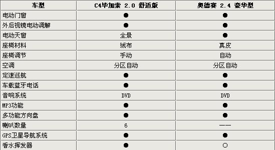 两款车型比较来看,C4毕加索属于新车型,奥德赛则是属于驰骋中国车市的老将了。但是两款同价位的车型在舒适配置方面均比较全面。自动分区空调、定速巡航、DVD、GPS导航系统均成为了它们的标准配置。但是这两款车型还是各有各自的特性。C4毕加索的天窗为全景式的,乘客可以充分的享受阳光(报价 参数 图片 论坛),香水挥发器则可以让驾驶舱内充满香味。奥德赛则是配备了真皮电动调节座椅。