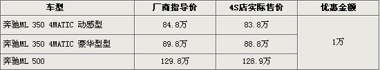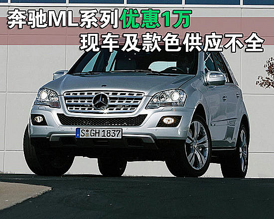据4S店销售人员介绍,目前奔驰ML系列车型现车的供应情况并不是很乐观,个别店内已没有现车,只能接受预定。而现有的车型主要以黑色和银色的ML350四驱豪华和ML500四驱车型为主,其他款色不太齐全。价格方面,现在购买的话可以在原来指导价格基础上优惠1万元(报价 参数 图片 论坛)。现售的奔驰ML系列主要是09款改款车型,销售人员介绍,除了在车灯等外形方面有变化外,内饰的方向盘也有小幅改动,配置上新增加了导航等。