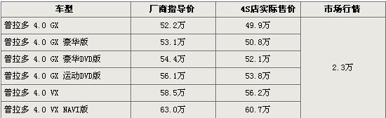 据4S店销售人员介绍,目前销售的车型主要是4.0VX系列车型,售价分别为58.5万和63万元,其中导航版VX销量最多。目前到店购车的消费者可以优惠2.3万元,4S店内现车主要是绿色和白色两款,这两款也是最受欢迎的车身颜色。其他GX系列因为在配置方面较低,所以销量并不多,现车也比较少,需要预订。