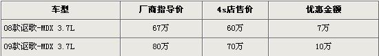 据经销商销售人员介绍,目前在售的讴歌MDX分为08款和09款两种车型,由于08款已停产,店内只有一辆现车,为了清理库存08款出现了7万元的优惠,售价从67万降到了60万,而09款讴歌MDX出现了高达10万元的优惠,售价也从80万降到了70万。销售人员还介绍,09款讴歌MDX增加的实用性的配件包括前下护板和后下护板,能避免恶劣路况对底盘带来的损伤,并且09款讴歌MDX还新增了巴厘海蓝和摩卡褐金两种颜色。