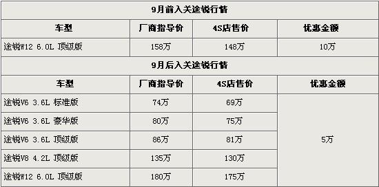 据经销商销售人员介绍,目前店内还有少量于9月份前入关的途锐库存车,车型不全只有最高配的搭配12缸的6.0L顶级版,售价还是原来上市时的158万元,并且岁末针对此库存车有10万元的优惠,售价降至148万元。销售人员还介绍,于9月份后入关的途锐车型虽然没有10万元的优惠,但也出现了全系5万元的优惠,低配入门级的V6 3.6L标准型售价经优惠后从74万降至69万,而最高配W1(报价 参数 图片 论坛)2 6.0L顶级型经优惠后售价也从180万元下降到175万元。上调后价格的途锐店内现车充足,消费者挑选的空间很大。
