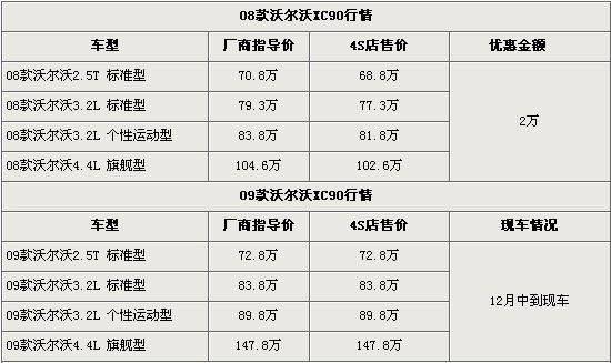 据沃尔沃经销商处销售人员介绍,目前店内库存的08款XC90车型全部优惠2万元,入门级的XC90 2.5T标准版从70.8万元降到68.8万元,而全系最高配的XC90 4.4L旗舰版售价也从104.6万元优惠到102.6万元。由于都是库存车,08款沃尔沃XC90 3.2L与XC90 4.4L现车情况一般,尤其是价格相对便宜的XC90 2.5T排量的车型目前只有标准版,而2.5T个性帆船赛纪念版与2.5T个性运动版均已无现车。销售人员还介绍,于前段时间上市的09款沃尔沃XC90将于12月中旬店内到现车,由于9月份大排量消费税的推出,新款的沃尔沃XC90在价格上会比08款上调一些,具体价格请参考上表。