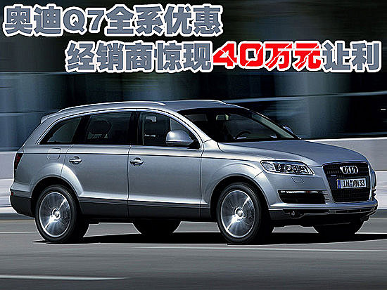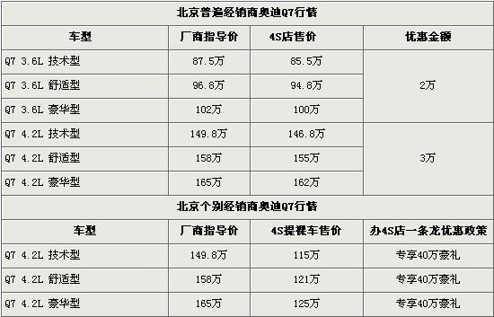 据经销商销售人员介绍,奥迪Q7分为3.6L和4.2L两种排量共7款车型,目前3.6L基本型没有现车,其他车型均有现车。近期3.6L车型全部下降2万元,优惠后3.6L车型售价分别为:技术型85.5万元,舒适型94.8万元,豪华型100万元;排量更大的4.2L车型下降3万元,优惠后售价分别为技术型146.8万元,舒适型155万元,豪华型162万元。同时,据北京百得利汽贸公司经销店销售人员介绍,现在该店有限量的10辆奥迪Q7 4.2L车型,由于这10辆车为9月1日前入的关,所以入关时的价格没有受到大排量消费税上调的影响。