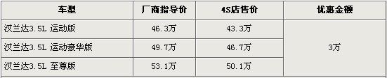 据经销商处销售人员介绍,汉兰达共有精英、运动、运动豪华、至尊四款车型,由于精英版为两驱车型,相对其他三款四驱车型其的关注度并不高,所以至今没有引进只以订单式销售,店内没有现车。其余三款店内都有现车车,并且于近日购买汉兰达的消费者还可以得到3万元的现金优惠。经优惠后,汉兰达运动版售价从46.3万元降到了43.3万元,运动豪华版从49.7万元降到了46.7万元,最高配的至尊版售价也降到了50.1万元。