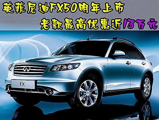 据英菲尼迪4s店销售人员介绍,目前英菲尼迪FX全系两个排量三款车型都有优惠,FX35优惠2.5万元,而排量稍大些的FX45更是出现了12.7万元的最高优惠。经优惠后,FX35标准版与超越版售价分别降为63.8万元和67.8万元,FX45巅峰版售价从93.5万元降到80.8万元。销售人员还介绍,全新一代的FX50将于明年2月份上市,售价大约是130万元,FX45现已停止进口。