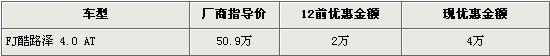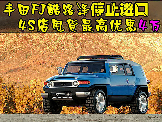 据广州丰田4S店销售人员表示,10月份FJ酷路泽在售价上调后首次松动了价格优惠2万元,由于FJ酷路泽现已停产以后不再进口,所以在这个岁末为了清理库存车再次加大优惠力度,优惠从2万元上翻至4万元,令此车从50.9万元的售价下降至46.9万元。此外,目前FJ酷路泽现车不多,多处商家已无现车,其颜色主要以蓝色与白色居多,欲购买者应快快出手。