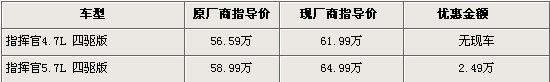 据经销商处销售人员介绍,近期在售的Jeep指挥官5.7L优惠2.49万元。由于店内的Jeep指挥官车型均为9月日前入关的,价格没有受到大排量消费税的推出而上调,4.7L与5.7L售价仍为56.59万元及58.99万元。目前店内指挥官4.7L版没有现车,所以为了清理5.7L库存车,岁末出现了2.49万元的优惠,优惠后,指挥官5.7L车型售价从58.99万元降到56.5万元。