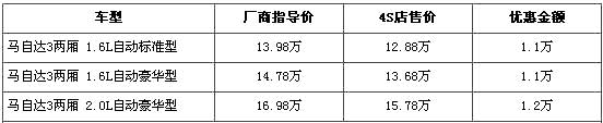 据经销商处销售人员介绍,马自达3两厢全系都有优惠,最高优惠达到1.2万元。目前马自达3两厢有1.6L和2.0L两种排量共三款车型在售。经1.1万元的优惠后,1.6L自动标准型和1.6L自动豪华型售价分别降至到了12.88万元和13.68万元,全系最高配的3.0L自动豪华型优惠金额达到了全系最高的1.2万元,售价从厂商指导价的16.98万元降到了15.78万元。销售人员还介绍,店内现车主要以红色为主,欲购买其他颜色的消费者需交1万元现金,最短约等1周可提车。