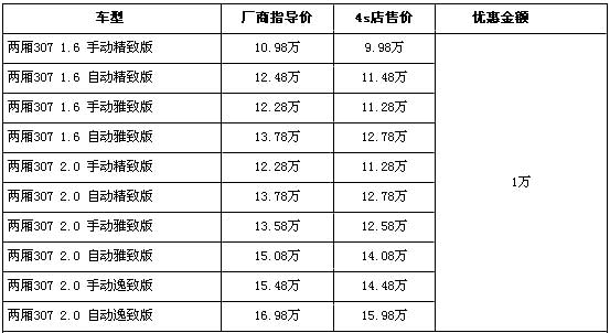 据东风标致经销店销售人员介绍,两厢标致307(报价 参数 图片 论坛)分为1.6L和2.0L两种排量,目前全系优惠1万元,入门车型的1.6L 手动精致版原厂商指导价为10.98万元,经优惠后售价跌破了10万元,仅售9.98万元,排量稍大两级的2.0L排量的低配车型2.0L 手动精致版售价也从12.28万元跌破12万元降至11.28万元。