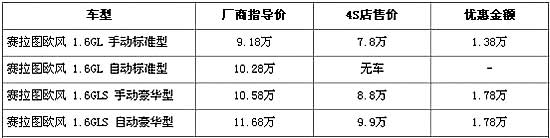 据经销商处销售人员介绍,赛拉图欧风全系最高出现1.78万元的优惠。赛拉图欧风在售的有4个车型,入门级的1.6L手动标准版经1.38万元的优惠后,售价从厂商指导价9.18万元降到7.8万元,1.6L豪华版的手动版和自动版车型都经全系最高1.78万元优惠后,售价分别降至8.8万元和9.9万元。经销商处销售人员还介绍,由于1.6L自动标准型没有现车所以没有在此次优惠的列队中,其他车型店内现车充足。
