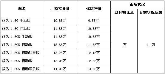 据东风日产4s店销售人员介绍,目前东风日产加大优惠力度,骐达全系提升优惠空间,让利金额从1万元上升至1.1万元,而且还维持原来附送5000元全险项目。优惠后,入门级的1.6G手动版售价从厂商指导价10.68万元,降到了9.58万元。现车方面除了刚上市的1.6GE 自动科技版无现车,需交1万元订金预订外,其他车型均有现车,挑选空间很大。