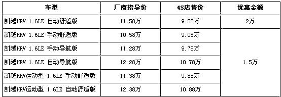 据经销商处销售人员介绍,凯越HRV共有6个车型在售,近期全系最高优惠2万元。入门车型的凯越HRV 1.6LE 自动舒适版经全系最高的2万元优惠,售价下降到9.58万元,而其他车型虽没有2万元的优惠,但是优惠金额也达到了1.5万元,入门车型的售价也降至到了9.08万元。目前店内现车充足,供消费者挑选的空间很大。