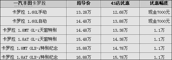 虽然卡罗拉也有1.6L排量的车型,但其产品销售重心还是体现在1.8L车型上。在2月份的销量数据 上,卡罗拉仍然显示出强劲的一面,这其中还是1.8L排量车型的功劳。因为在新购置税政策的影响下,卡 罗拉1.6L车源供应问题一直处于紧张的状态,而且市场优惠大幅回收。但一汽丰田厂方并不争急于向市场 供应大量1.6L车型。反而在主力1.8L车型上放宽优惠幅度,以达到车系上的平衡。笔者从一汽丰田的4S店 了解到,卡罗拉目前1.8L车型的优惠幅度达到了1.1万元。销售人员表示进店后还将有优惠的余地。而 1.6L车型订车需要1个月时间,其优惠仅在7000元左右,倾向性已经明显了。
