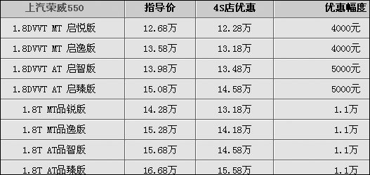 由于一直致力于品牌的打造,加上货源上的控制有方,荣威550几乎在大半年时间内优惠都是维持 在6000元左右。随着今年初1.8VVT新款产品推出,其产品线进一步壮大,但不巧也撞上购置税减免政策的 实施。近期荣威550 1.8T的价格开始出现大幅松动的迹象。笔者从荣威的4S店了解到,新上市的1.8DVVT 的新车型可以送5000元油卡,或折成现金。而1.8T车型优惠也扩大到1.1元。二级市场上更是在现金优惠 1.5元的基础上加送礼包,而且目前车源情况充足,低调许久后的荣威550似有大力冲量的准备。