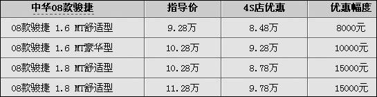 新一代的骏捷FRV、Wagon等产品如今已成为华晨中华冲击市场的焦点。作为华晨汽车老功臣之一 ,骏捷的市场已经逐渐地退居二线,不过在这款车的性价比上仍然有当年脱销一时的风范。笔者从上海的 华晨汽车4S店了解到,08款骏捷现在的产品主要以1.6L和1.8L为主,其中1.8L最高优惠达到了1.5万元, 与1.6L车型优惠后的价格不相上下,二者之间基本上是一个购置税的差价。