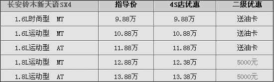 长安铃木的全新天语SX4在3月10日公布价格后,不到一周的时间内,长安铃木商家们已经按捺不住 ,开始大力促销把新款产品全面推向市场。笔者从长安铃木4S店了解到,新款的1.6L、1.8L多款产品开始 接受预订,提车周期在15天内,为了进一步促进订单,可以在订车时加送装潢。特别是在购置税减免外的 1.8L新天语,可以现金让利5500元,并加送4188的装潢礼包。1.6L系列车型亦可享受2000元油卡。目前老 款天语SX4商家处还有少量库存,价格优惠在8000元左右。