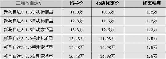 近期新一代马自达3已经在全球亮相,但是目前没有引入国产的计划,长安马自达将在今年对现款 的马自达3进行配置上的升级,将在4月份推出1.6L天窗版新车型,以扩大产品的阵容。笔者从上海的长安 马自达4S店了解到,前段时间优惠回收的三厢马自达3,进入3月后价格出现再度松开的迹象。特别马自达 3 2.0L最高优惠达到了1.5万,1.6L需要两周的预订期,优惠幅度保持在1.2万。不过二级市场上,马自 达3 2.0l的报价优惠已经达到了1.8万。