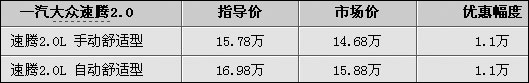 近日,一汽大众上海经销商齐齐开展了针对速腾2.0车型的优惠活动。据商家透露,此次优惠活动 是在厂家的最新优惠政策下开展的。虽然目前整体来说一汽大众的车源比较紧张,其中尤以新宝来(报价 参数 图片 论坛)、速腾 的1.6L车型更加紧俏。但商家表示,速腾2.0L车型目前货源还是充足的,并且现在推出包括减免购置税在 内的万元优惠活动。每家经销商对这万元的优惠内容不尽相同,有的以减免购置税的形式,有的以装潢礼 品和现金让利的组合形式。总体幅度均可达到1.1万元,而1.6L的优惠在6000元左右。为了备战1.4T速腾 ,1.6L已经在产能上开始让步。