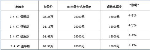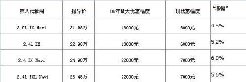 小编点评:作为去年国内B级车市场的销售冠军,广州本田旗下的雅阁在今年继续着不错的销售势头。即使在金融海啸肆虐的1月份,雅阁的销量依然突破了10000台,达到了10467台;2月份,雅阁的销量虽然出现了一定的下滑,但是8529台的月销量足以保证其在该级别市场的霸主地位。目前购买雅阁的终端优惠幅度已经较年前有着大幅的缩小,广州地区4S店销售人员给出的解释是,目前经销商销售雅阁厂商暂时没有返点优惠,因此经销商方便唯有通过提高终端售价确保一定的利润。