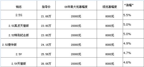 小编点评:一汽丰田锐志是一款后轮驱动的典型运动型轿车,和雅阁和凯美瑞相比,商务气质方面不是那么突出。购买的人群多为年轻消费者。锐志自上市以来销量一直在“雅凯”之后,但成绩也差强人意。然而进入到2009年,锐志的供货量突然减少,广州和深圳地区各家经销店内库存车寥寥无几,几乎所有型号的车型都需要预定,最长的提车周期甚至长达2个月,这和新车上市已经无任何区别了。据4S店的销售人员介绍,由于厂商在今年下调了车型的产销目标,导致车辆供应相对不足,因此车型的终端售价反而要比去年年底有着不小的提升。