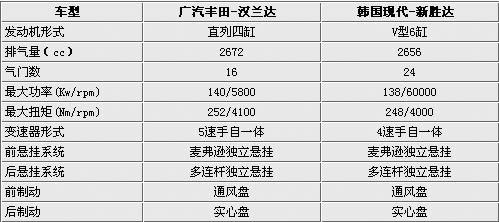 汉兰达和新胜达的排量均为2.7这个区间,但是在发动机形式和技术上却存在着本质区别。汉兰达的引擎为直列四缸,该发动机配备了双VVT-i技术,实现了卓越的动力输出,同时进一步提高了燃油经济性。新胜达则配备的是动力输出更加平稳的V型6缸发动机。两款车型在动力输出上,汉兰达占据了明显优势,这一点从动力输出上就可以明显看出。在变速器方面汉兰达都配备的5档手自一体变速器,新途胜则是4速手自一体变速箱。制动方面两款车型都是采用的前通风盘后实心盘式的刹车。