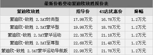 对于蒙迪欧致胜现在的市场处境,不仅是目前新君威、迈腾DSG版的冲击,还有马自达6(报价 参数 图片 论坛)睿翼、新领驭等重量级新车陆续登场后的压力,难以突破的市场销量让蒙迪欧致胜的“换心”策略变得更加紧迫。近日,记者从上海长安福特某4S店经销商处获悉,目前蒙迪欧致胜沪上仅优惠1.2万元。以下是蒙迪欧致胜详细报价表: