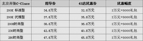 市场情况:奥迪A4L(报价 参数 图片 论坛)的上市大大分流了奔驰C级(报价 参数 图片 论坛)的目标客户群,所以C-Class也终于抵不住了,在上市大半年后推出了现金优惠方案。据悉,C-Class全系均可优惠2万元现金,另外再送价值5000元的礼包组合。而且现车充足。