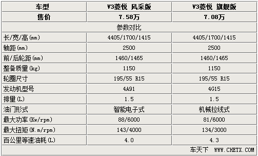 通过表格中的数据可以发现,两款车型的车身尺寸以及轴距和重量均完全一致。但即将上市的V3菱悦风采版的4A91引擎动力表现要略高于旗舰版所搭载的4G15引擎,在满足城市代步需要的同时,更可以带来更多的激情享受。另外消费者所关心的油耗方面V3菱悦风采版也表现的更为出色。