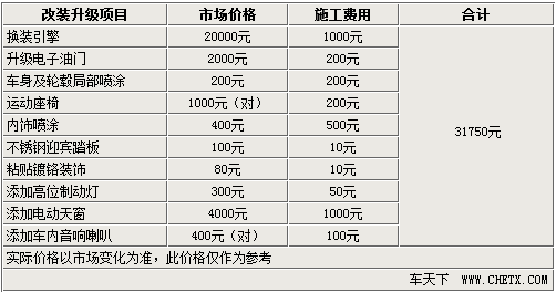 通过上文的对比,可以发现两款兄弟车型在外观以及内部的绝大多数配置均极为近似,那么升级后的风采版是否真的物有所值呢?网上车市网站也根据新车所添加的多项配置咨询了改装装饰市场,计算后的整体升级居然价值3万余元,即使不计入引擎的换装费用,剩下的过万改装费用也相当高昂。